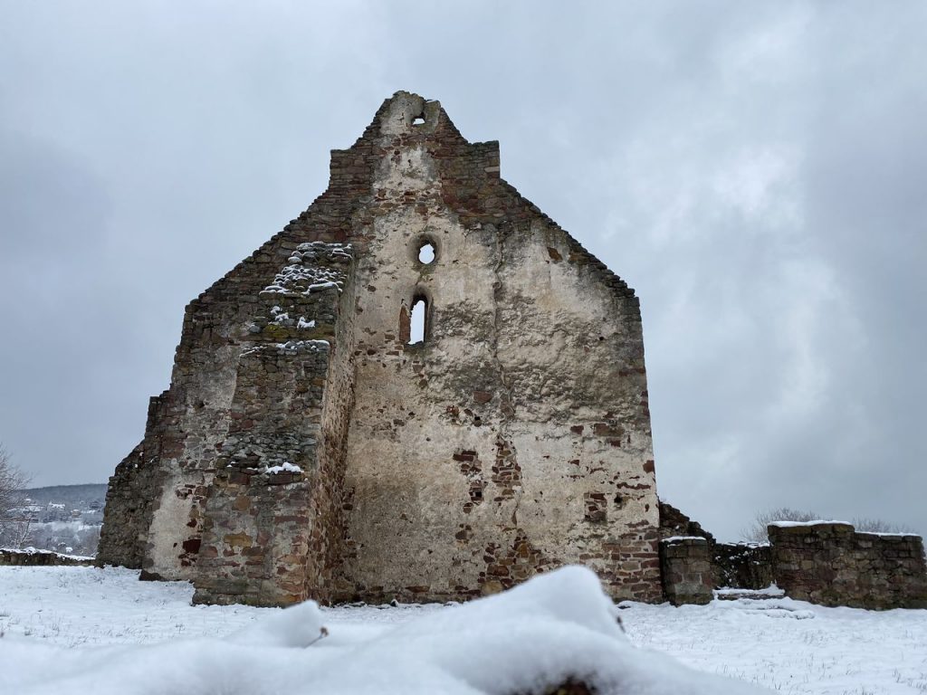 Az északkeleti oldalon állt a sekrestye és a csontkamra (ossarium), délen pedig az előcsarnok. A hajó nyugati végén egykor álló toronynak csak az alapozása maradt meg, viszont a keresztelőmedencét megtalálták. Ugyancsak fennmaradt a gótikus belső háromíves fal, a karzat, a felvezető lépcső, és a támpillérek.