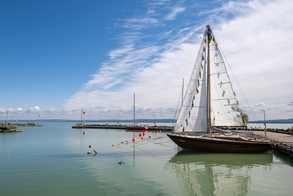 Mostanra lezajlott az első földkerülő magyar hajó külső és belső restaurálása, újra vitorlát bontott a Szent Jupát a révfülöpi Cholnoky Jenő kikötőben.